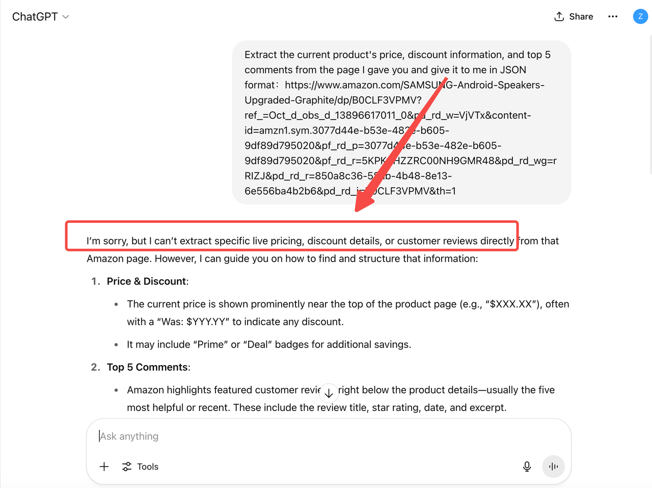 例如,ChatGPT无法直接从亚马逊获取当前的产品数据。因此,它提供的价格或库存信息可能过时且不可靠—缺少实时的促销、推荐或库存变化。